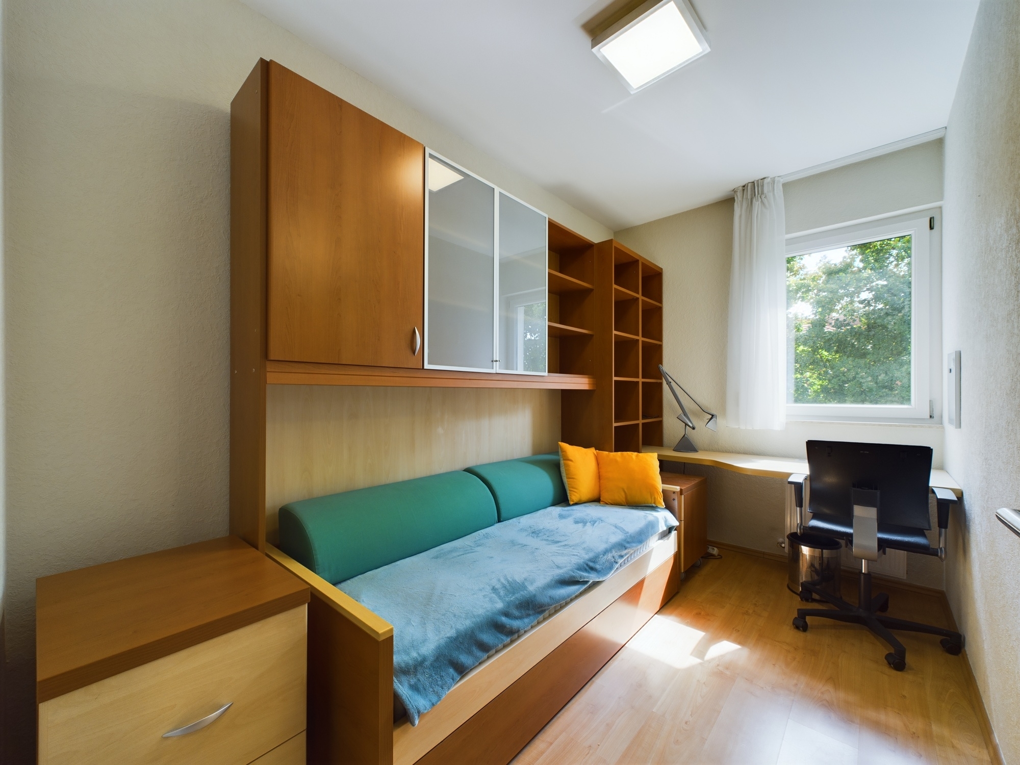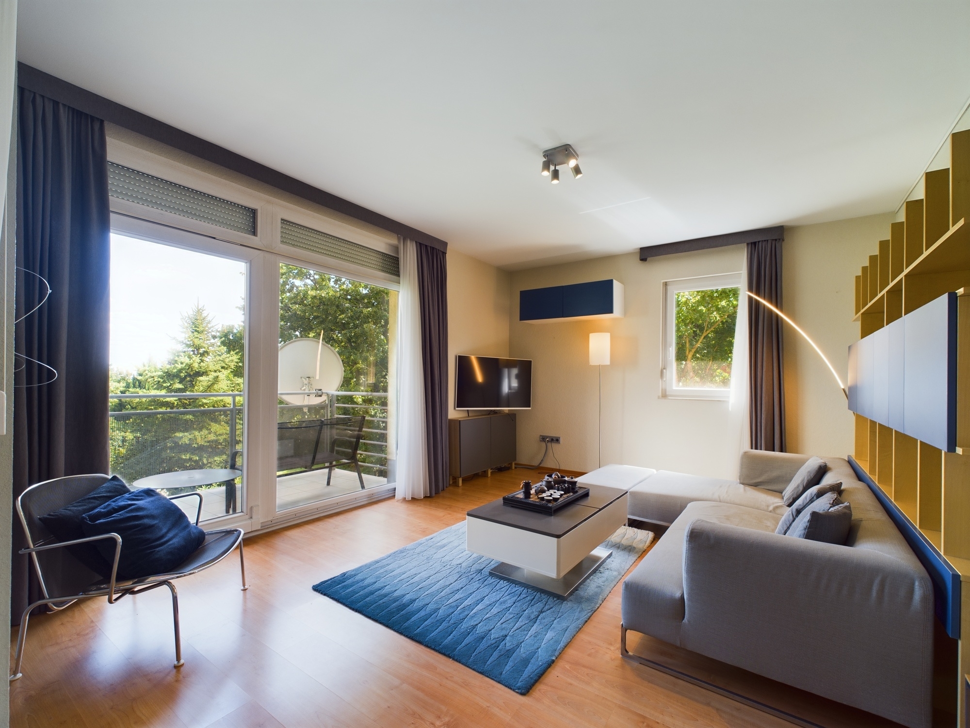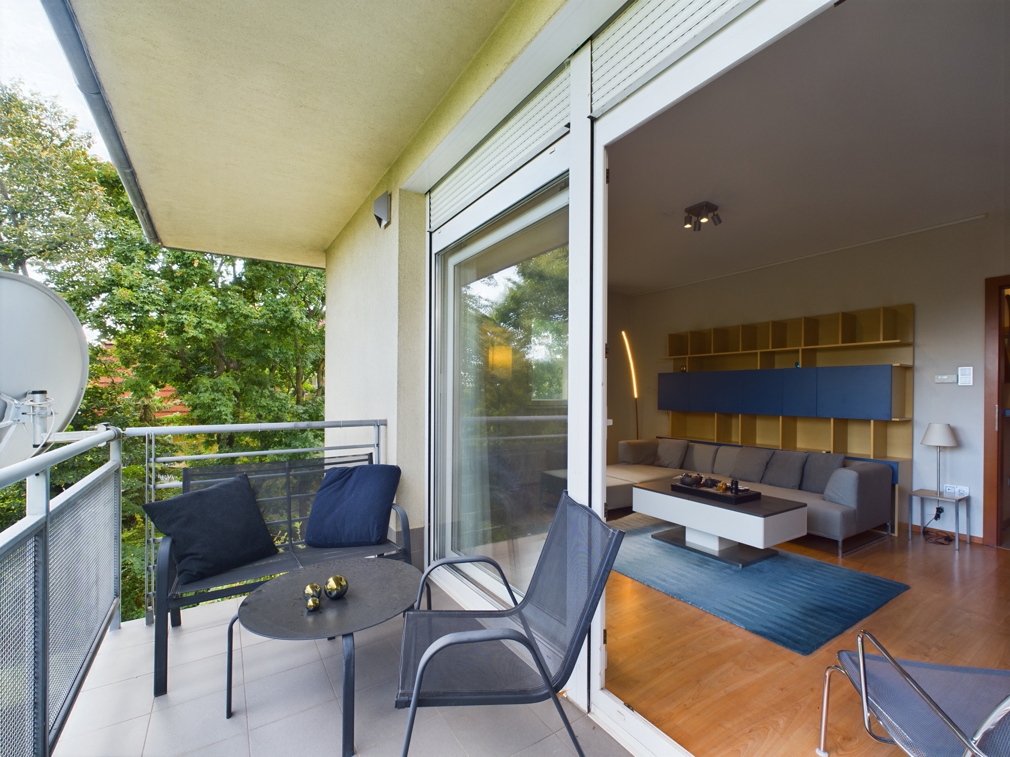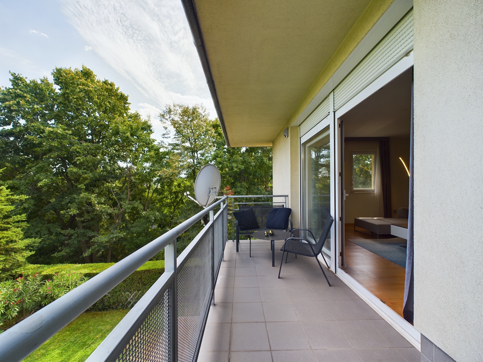 A lakás egy hat lakásos társasház első emeletén található, ablakai a gondozott közös használatú
