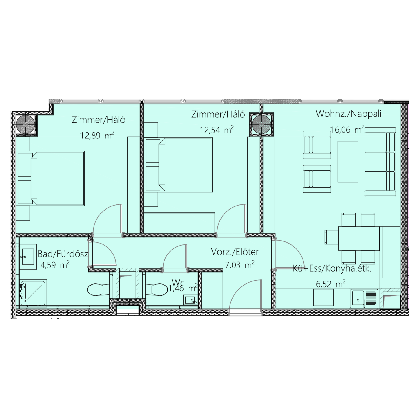4. emelet / udvari / 61m2 / 2 háló / 1 fürdőszoba / amerikai konyhás nappali / 2 wc / előtér