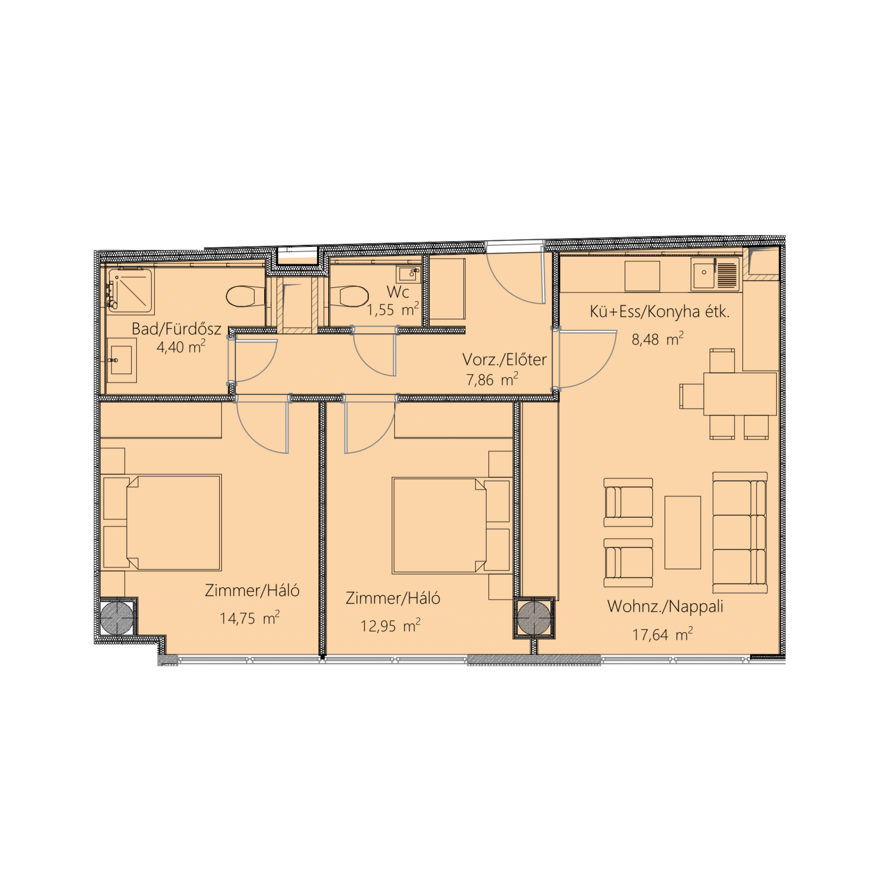 5. emelet / udvari / 68m2 / 2 háló / 1 fürdőszoba / 2 wc / amerikai konyhás nappali / előtér