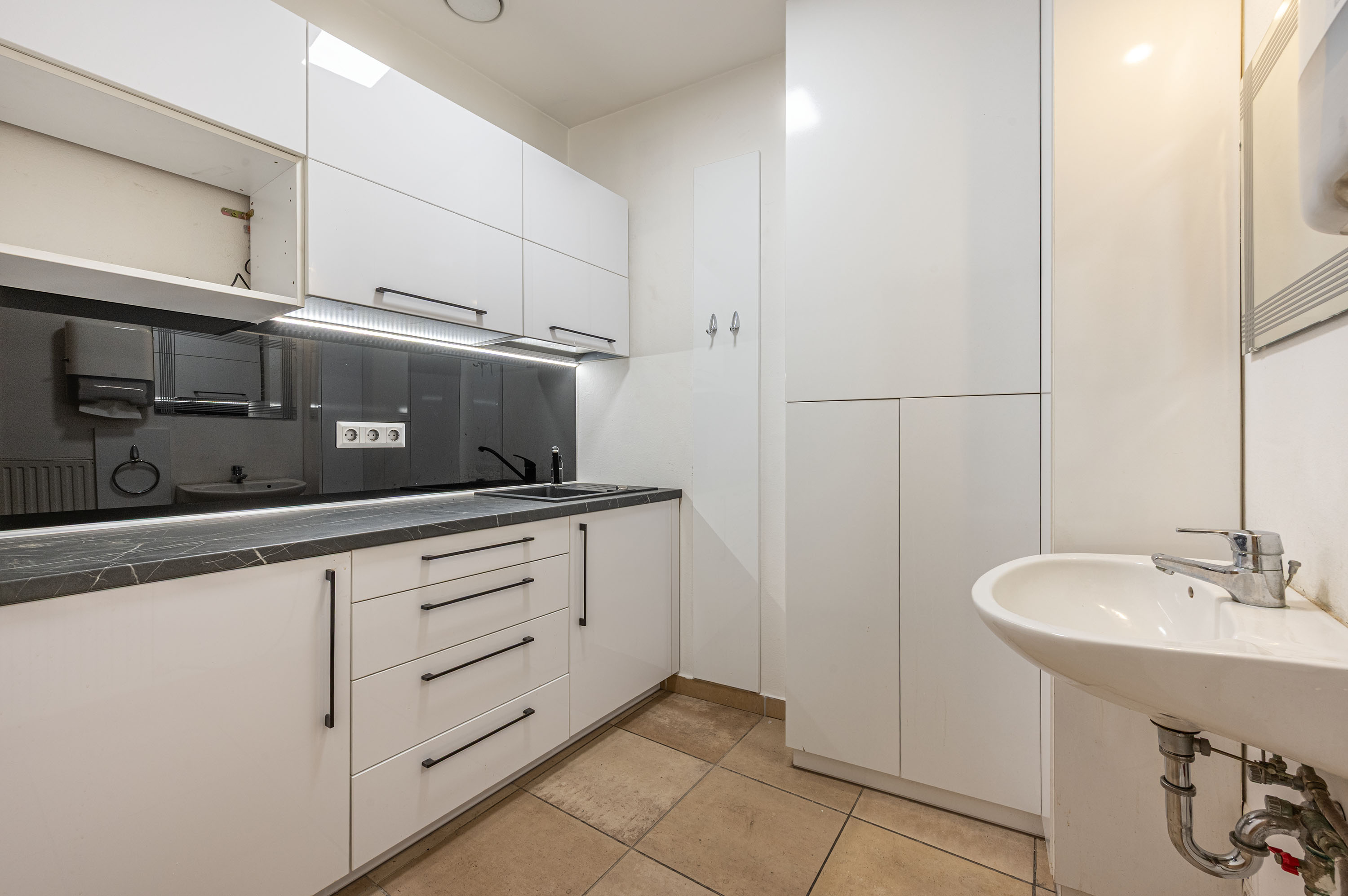 A felső szinten egy nagy helyiség, egy különálló iroda beépített bútorral, teakonyha és mosdó található. Az alsó szinten, ami egy nagy helyiségből áll található még egy tárolóhelyiség is.